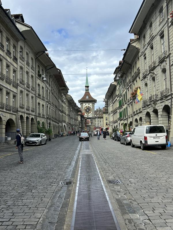 随团去附近的伯尔尼大教堂。走到最前面,在侧面的座椅上自拍。默祷,主啊,引导我。出门后退到广场最后边,拍教堂。然后,镜头转向几个修理工,他们用钻机撬开广场上的一块小石板,换上新的——但颜色看起来还是那么古旧。