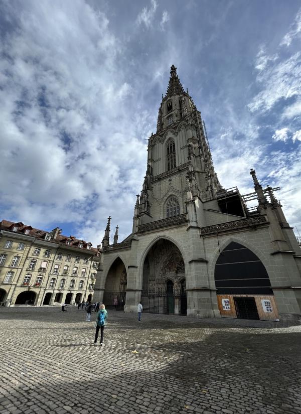 伯尔尼的街道也误导了我:不见宽敞的马路和办公大楼。路过一座大桥,两股河水奔流,岸边矗立着一座高大的教堂——伯尔尼大教堂(Bern Minster)。它远超周围楼房,红红绿绿青青,散发着宁静的气息。