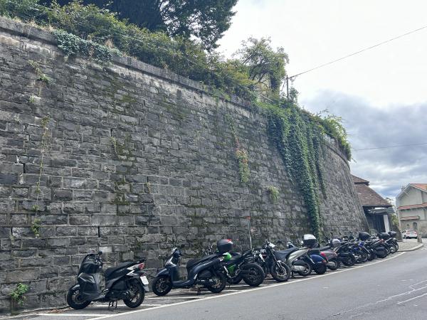 我们进了一个大教堂,教堂前的大墙引人瞩目:很多藤蔓顺墙垂下,沿着墙根,停放了好些摩托车。