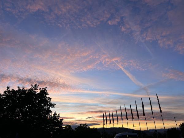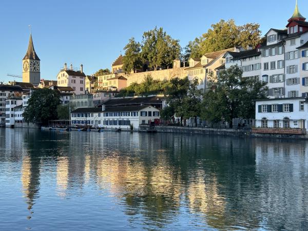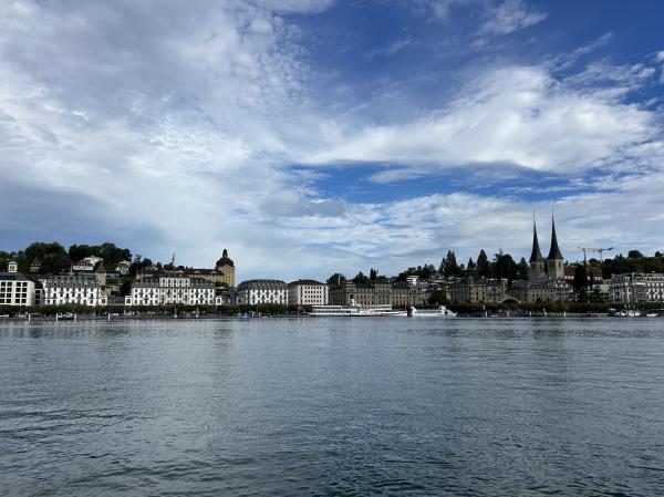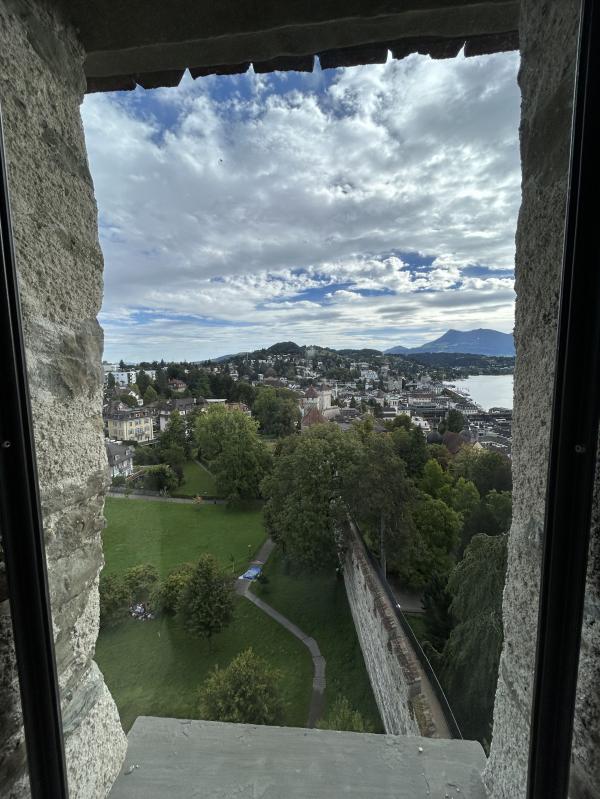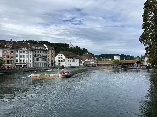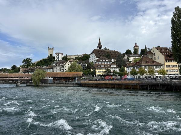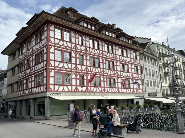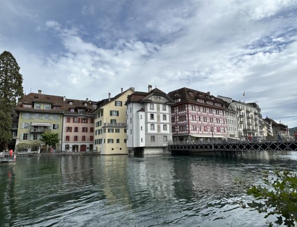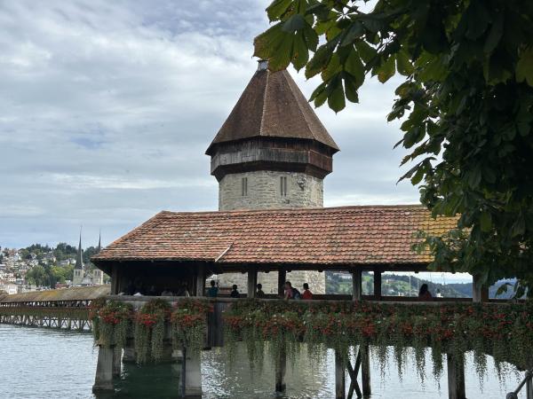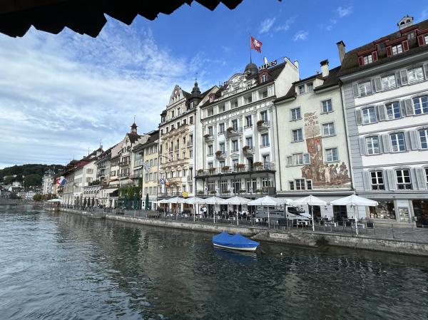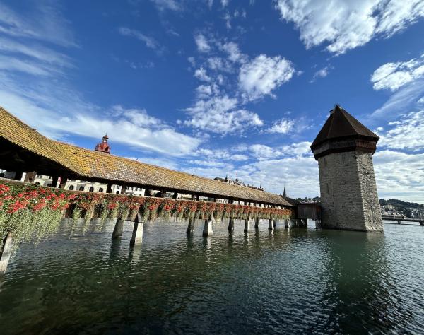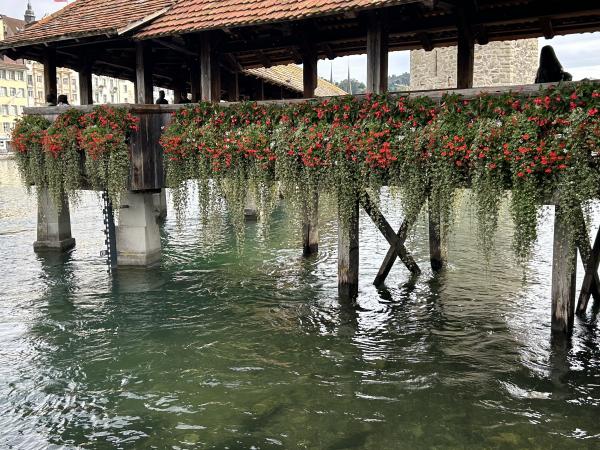 我立即奔向地标——卡佩尔桥(Chapel Bridge)。虽经历一次大火,但这座十四世纪木桥风韵犹存。桥廊穹顶画满了古老故事,有些颜色已脱落。两侧悬挂许多花盆,鲜红与丽日争艳。天蓝、云白,水碧。人如我,悠悠。停留片刻,呼吸从湖面传来的清新气息