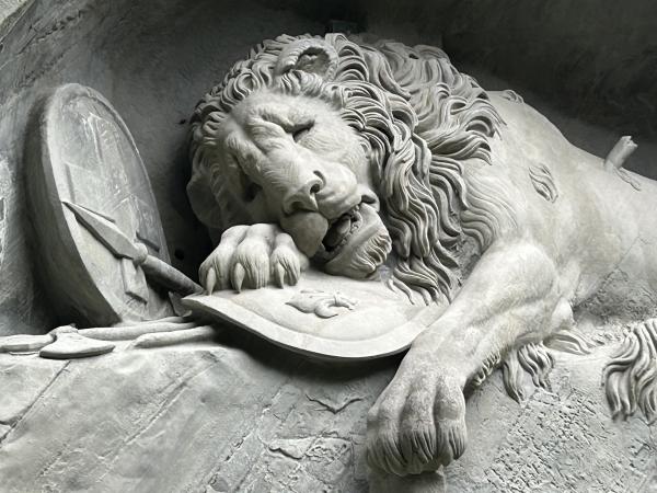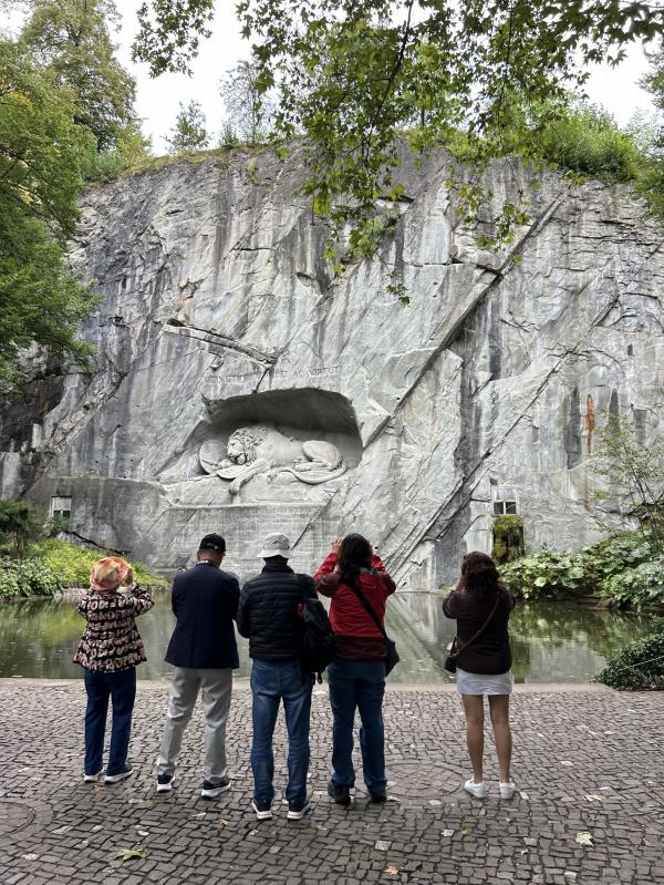 集合后,一起去狮子纪念碑。走几步就到了。一个安静的公园里,隔着一池水,对面巨大砂岩岩壁上,刻着一头垂死的雄狮。狮子侧卧,背插断矛,表情痛苦、眼神悲伤,充满力量与悲壮。它右前爪护法国百合花盾牌,左前爪下瑞士十字盾牌。正上方拉丁文铭文深沉:HELVETIORUM FIDEI AC VIRTUTI(“献给瑞士人的忠诚与勇敢”)