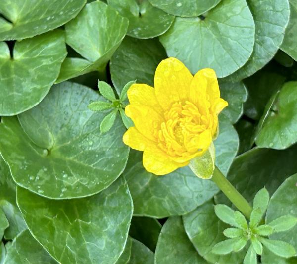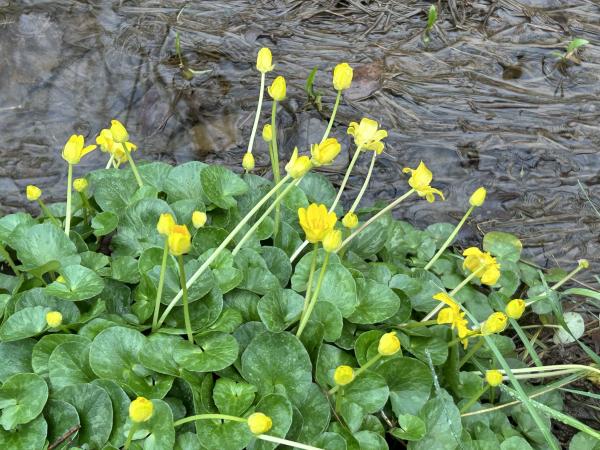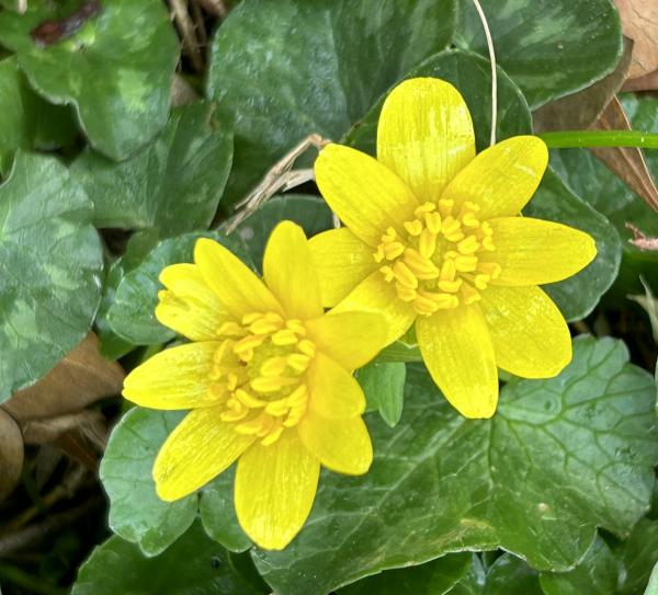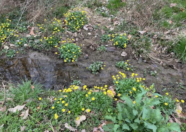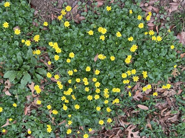 我一直以为它们是驴蹄草(Caltha palustris,英文marsh marigold或kingcup),错了。Grok看过照片后确认,是小毛茛,学名Ficaria verna,英文lesser celandine或fig buttercup。驴蹄草四五个花瓣,它十几个。