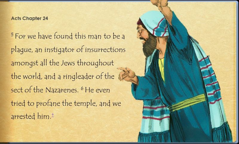 “我们看这个人,如同瘟疫一般,是鼓动普天下众犹太人生乱的,又是拿撒勒教党里的一个头目。连圣殿他也想要污秽。我们把他捉住了。要按我们的律法审问,不料千夫长吕西亚前来甚是强横从我们手中把他夺去,吩咐告他的人到你这里来。你自己究问他,就可以知道我们告他的一切事了。众犹太人也随着告他说,事情诚然是这样。”(徒24:5-9)
