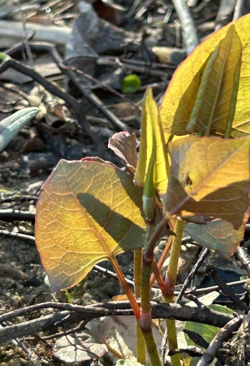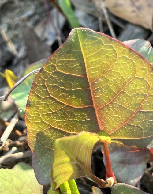 一开始,看到的是垃圾,后来我竟看到了一种从未见过的植物,叫“虎杖”,就长在石头间的淤泥里。它们刚刚冒出泥土不久,叶子如心型,颜色从橘红、紫红到深红。晨光下,叶脉的纹路如条条街道,微微陷下去的一条条细缝竟是乳黄色,对着太阳,闪烁微光。