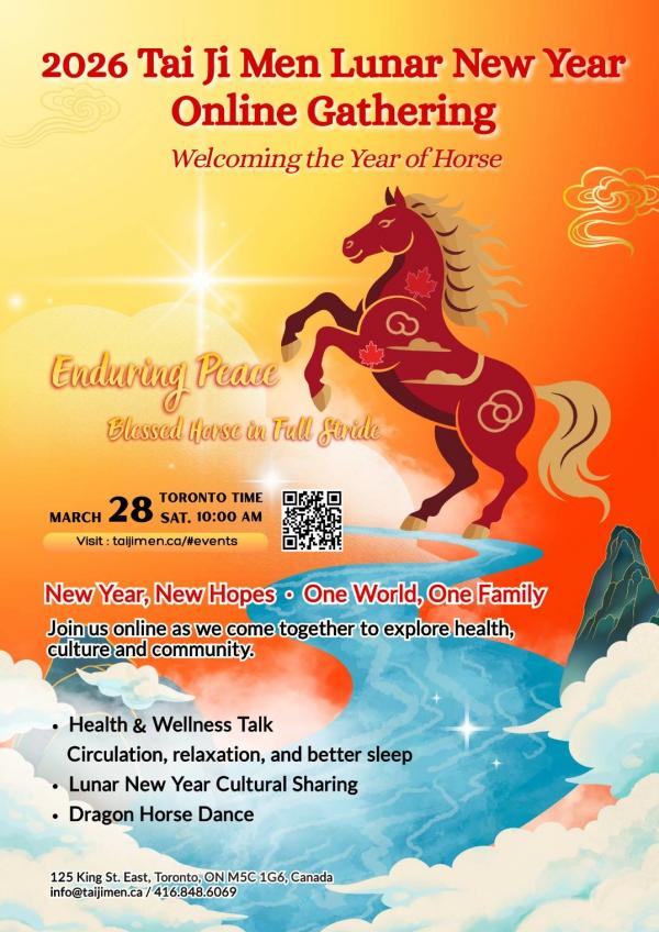 位于多伦多的太极门(Tai Ji Men in Toronto)将于3月28日上午10时(EST)透过在线直播举办「福马迎春」2026新春文化茶叙,邀请各界朋友透过云端相聚,一同认识华人新年文化,并在轻松温馨的氛围中交流节庆文化与健康生活理念。