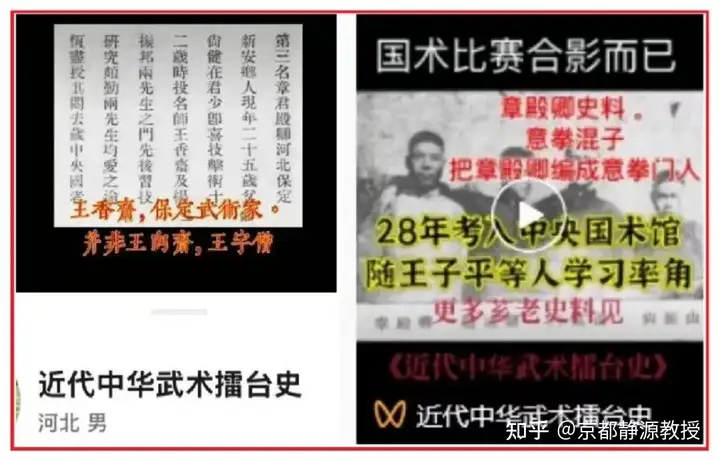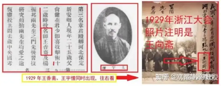关于“王芗斋”名字的写法,当时文献中出现了“王芗斋”、“王宇僧”、“王向斋”或“王香斋”。拳混子们抓住《浙江游艺大会会刊》中写成“香山”的“香”字,便试图攻击我的论文用了“谐音梗”,称此“王香斋”非彼“王芗斋”。这完全无视了史料录入人员出现错误的常识。当年的接待人员是浙江人,听着保定口音的章殿卿介绍师门,将“芗”误记为“香”或“献”非常正常。我翻阅了整本《浙江游艺大会会刊》,发现类似重大登记错误达80多处。有些拳混子说根据《浙江游艺大会会刊》记载:“章殿卿十二岁投名师王香斋”,他师傅不是出席大会的那个“王宇僧”,言外之意是当时“王宇僧”还不叫“王香(向)斋”呢。拳混子们完全忘记了当时“王宇僧”的“向斋”之名——这个名字仅凭口述和闻听,经常被人误写成“香斋”甚至“献斋”,尽人皆知的错误不可避免——更不知道“王香斋”这个名字的出现,就是大会工作人员登记时的失误,就以为自己只要拿到手“章殿卿十二岁投名师王香斋”这句话就证明章殿卿的师傅不是意拳门的那个“王向斋”就够了,至于“王香斋”和“王向斋”是否为同一个人,他根本不想去问。根据他那点学术水准,他也根本搞不懂!他目的就是用完锯箭法,然后就公开宣布“意拳门一些混子除了胡编历史,还用上了谐音梗”了。三个名字同时出现在1929年,见如下:
