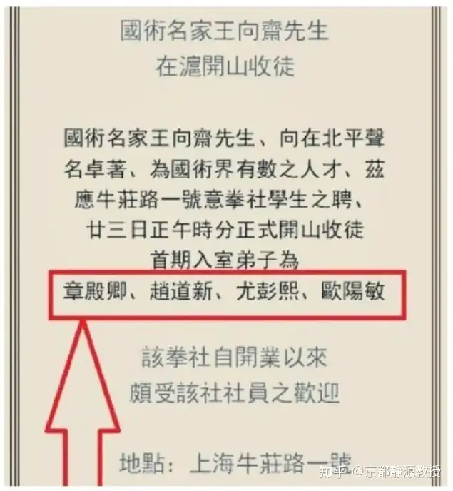 1931年10月23日的一份刚登陆上海的小报《上海诚报》上有一张浅黄色的插页广告。该广告全文如下:“《国术名家王向斋先生在沪开山收徒》:国术名家王向斋先生、向在北平声名卓著、为国术界有数之人才、兹应上海牛庄路一号意拳社学生之聘、廿三日正午时分正式开山收徒。首期入室弟子为章殿卿、赵道新、尤彭熙、欧阳敏。该拳社自开业以来颇受该社社员之欢迎。地点:上海牛庄路一号。”我在以往的文章中专门谈过这个问题,现在再次引用如下: