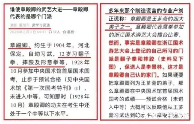 童旭东通过章殿卿在1929年杭州擂台赛上的登记信息,试图全盘否定其与王芗斋的师徒关系,并将其武艺跨越式进步归功于李景林一人。这种叙事不仅无视了民国武术界“转益多师”的常态,更混淆了官方背景(推荐人)与艺术传承(师承)的区别。