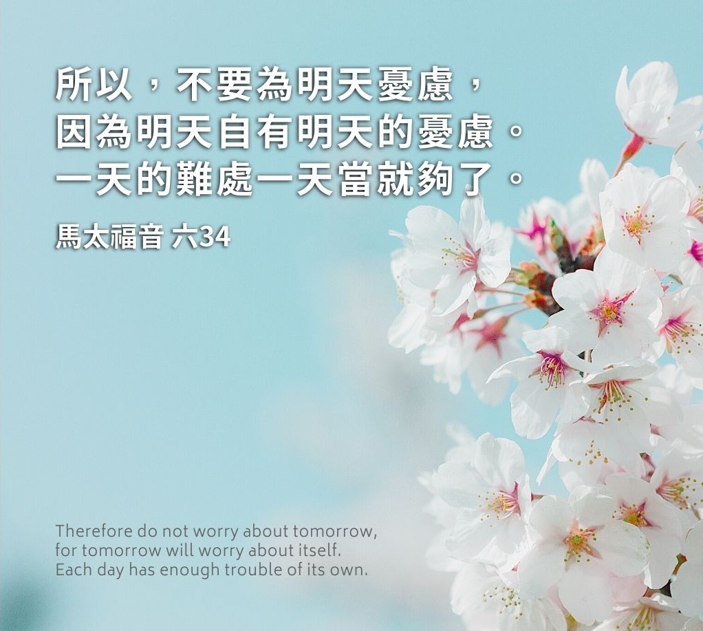 “不要为生命忧虑吃什么,喝什么;为身体忧虑穿什么。……不要为明天忧虑,因为明天自有明天的忧虑;一天的难处一天当就够了。”(太6:25,34)