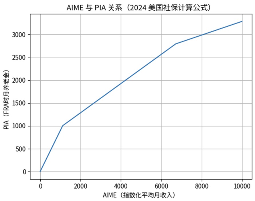 我们不妨用上述公式画出一张图。定个人的平均收入(AIME)从零一直到1万美元(SSN税,以前长年只收到接近十万,以上不交SSN税,只是最近若干年才提高收税门槛),那么 PIA vs. AIME 图即为:
