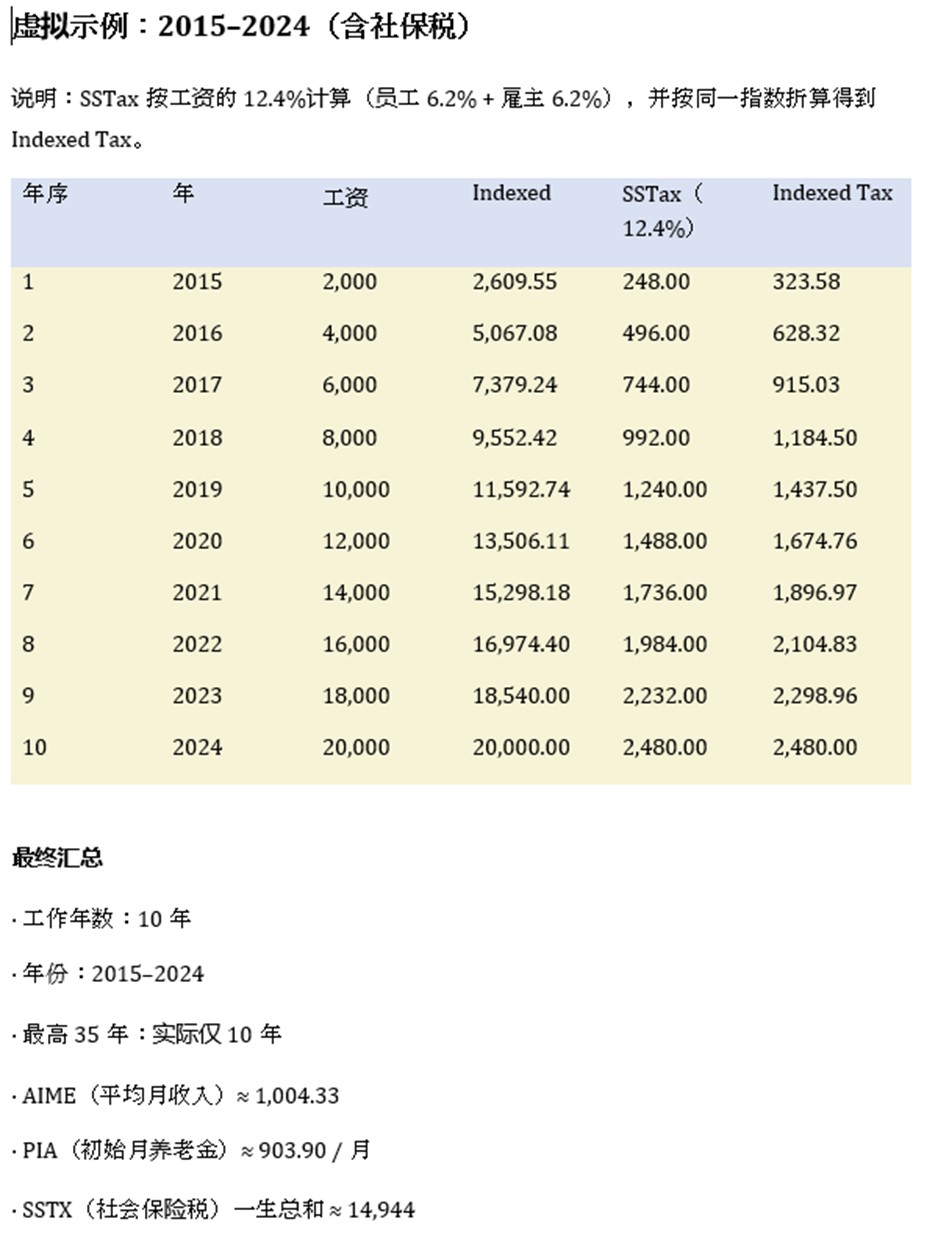 说明:SSTax按工资的12.4%计算(员工6.2% + 雇主6.2%),并按同一指数折算得到 Indexed Tax。