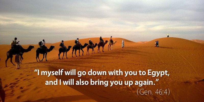 以色列带着一切所有的,起身来到别是巴,就献祭给他父亲以撒的神。夜间,神在异象中对以色列说:“雅各!雅各!”他说:“我在这里。”神说:“我是神,就是你父亲的神。你下埃及去不要害怕,因为我必使你在那里成为大族。我要和你同下埃及去,也必定带你上来,约瑟必给你送终。”雅各就从别是巴起行。以色列的儿子们使他们的父亲雅各和他们的妻子、儿女,都坐在法老为雅各送来的车上。(创世记46:1-5)