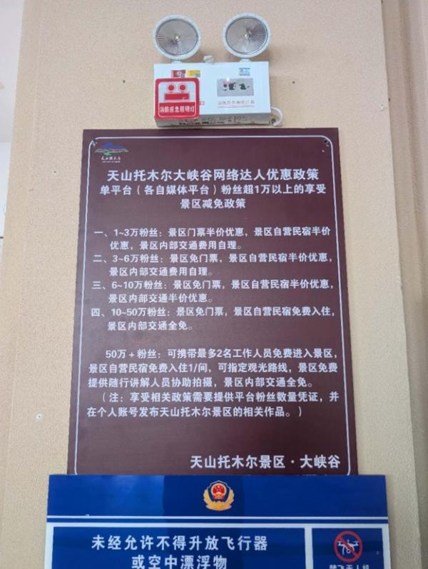 峡谷门口看到下面这很有意思的告示。拥有50万以上粉丝的网红,进入峡谷免费,景区内民宿免费,交通免费,还可以带领两个助手进入同样也免费。