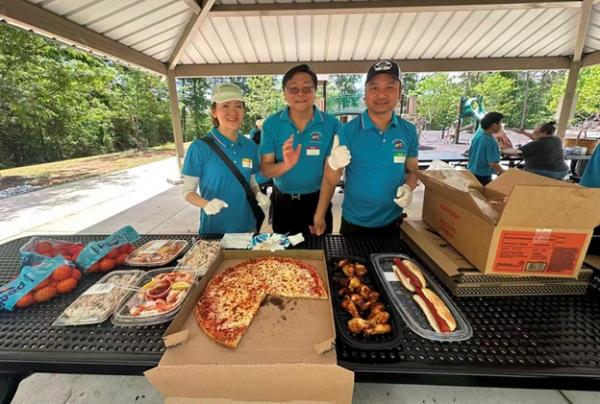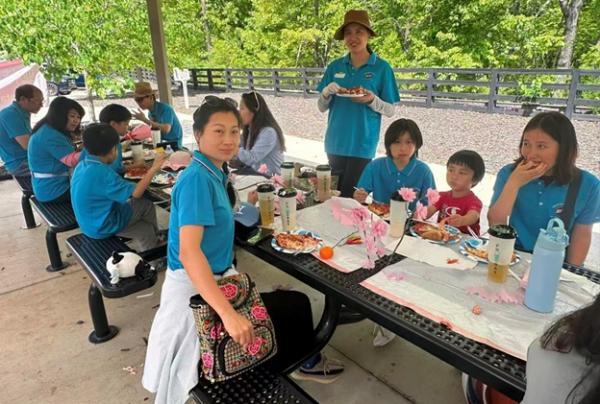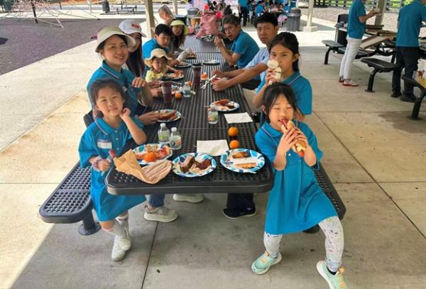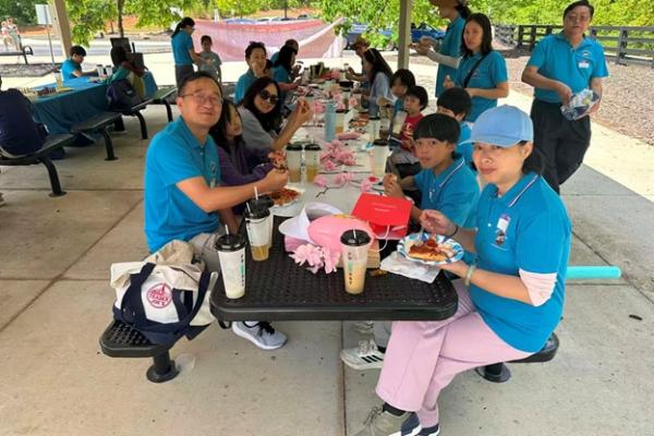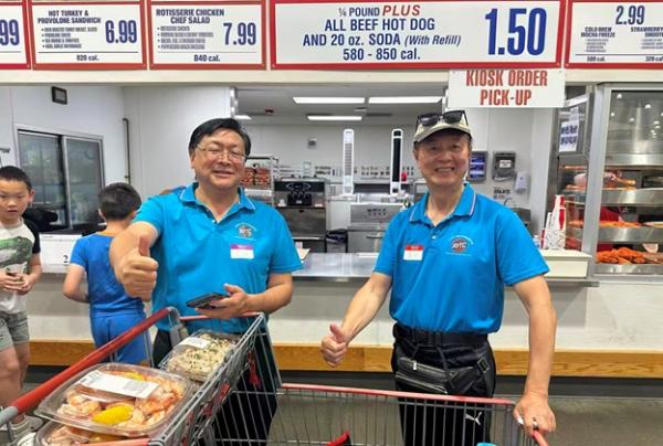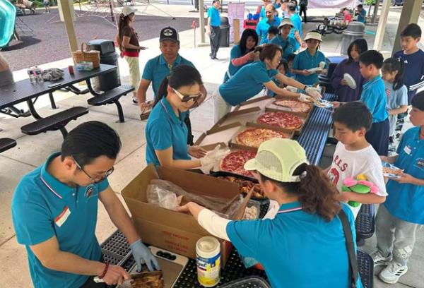 12:10,大家期待的午餐时间到来。Pizza、热狗、烤排骨、烤鸡翅、手撕鸡、蔬菜虾、水煮虾、小橘子……美食从Costco搬上了桌。运动了一上午,正是补充能量的时候。俱乐部的干部为大家分餐,大家边吃边聊,沐浴着春光,感觉和在家里吃饭完全不一样。
