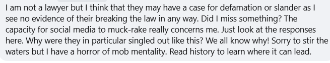 “我不是律师,但我觉得这几个人可能可以就诽谤或中伤提出控诉,因为我没看到他们有什么违法行为。难道我漏掉了什么?社交媒体上这种舆论攻击真的让人担忧。