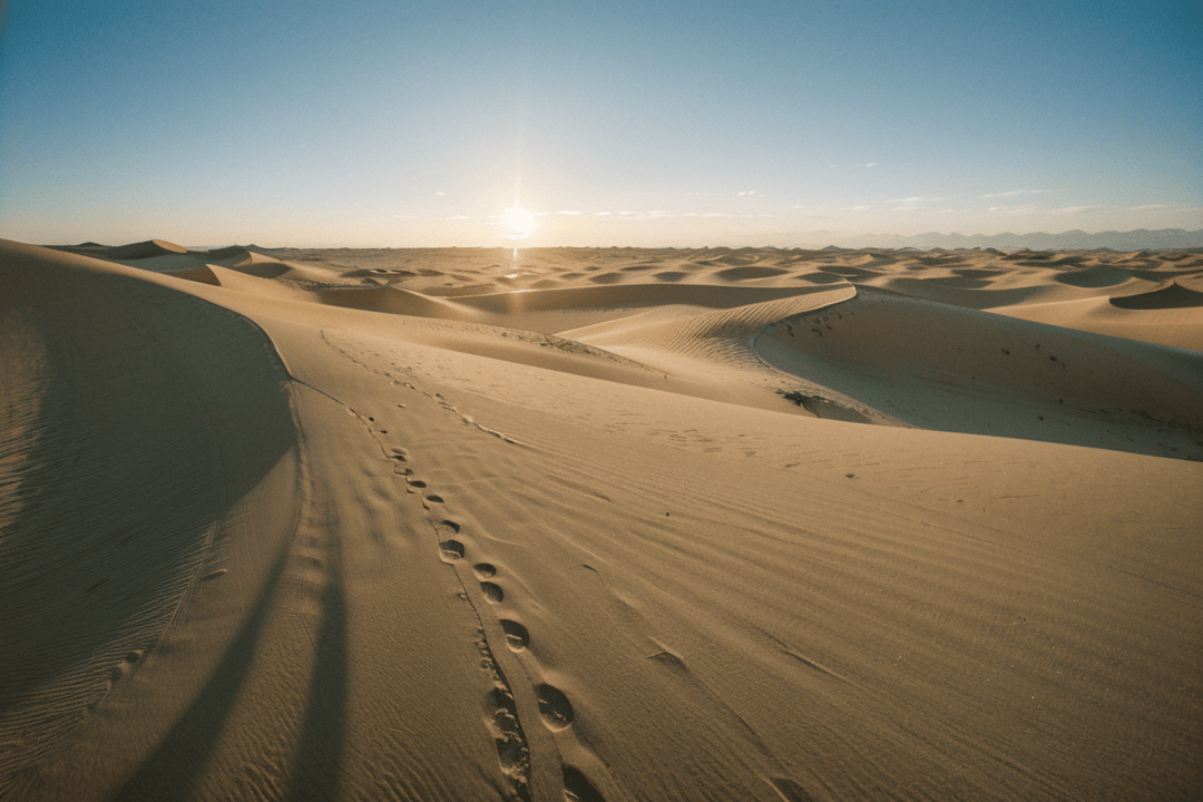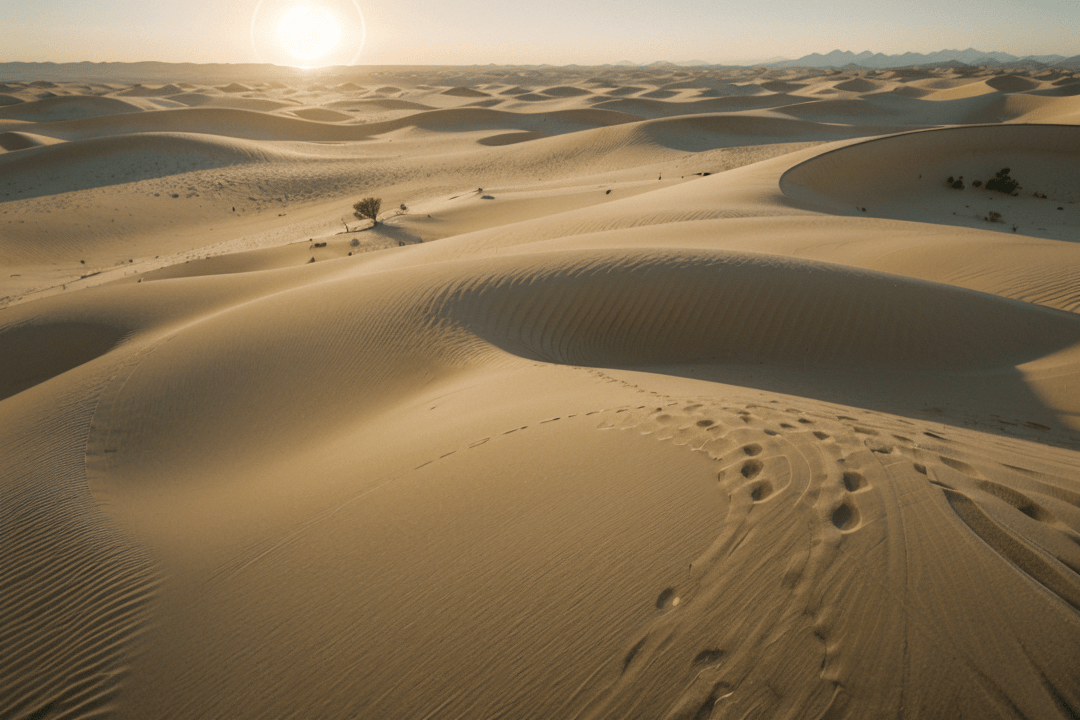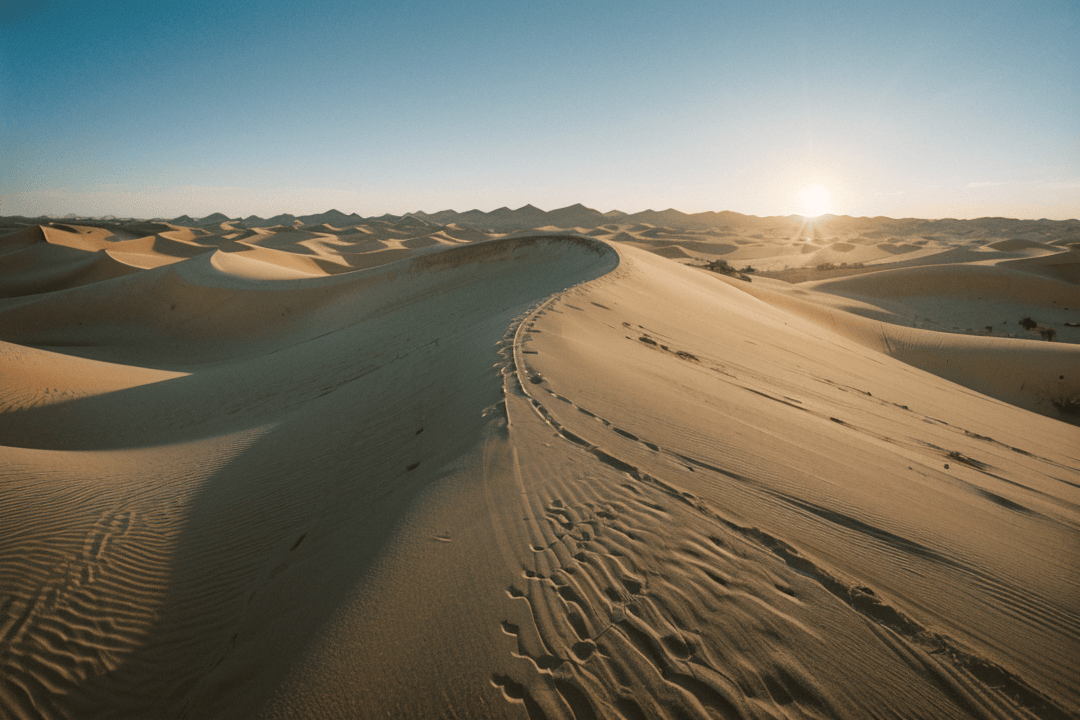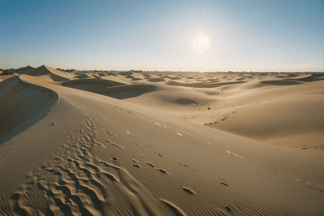 正午时分,撒哈拉展现出它的另一种性格。烈日当空,沙丘表面炽热,空气因蒸腾而扭曲。视野尽头,偶尔会出现海市蜃楼的幻象,仿佛有湖泊在闪烁,吸引旅人前行。