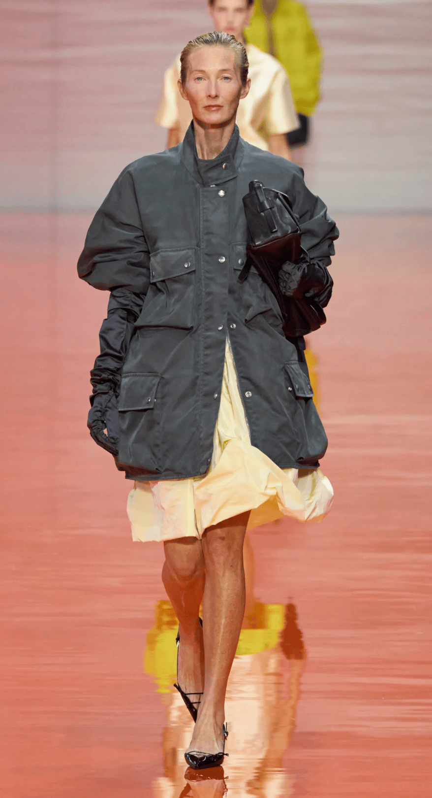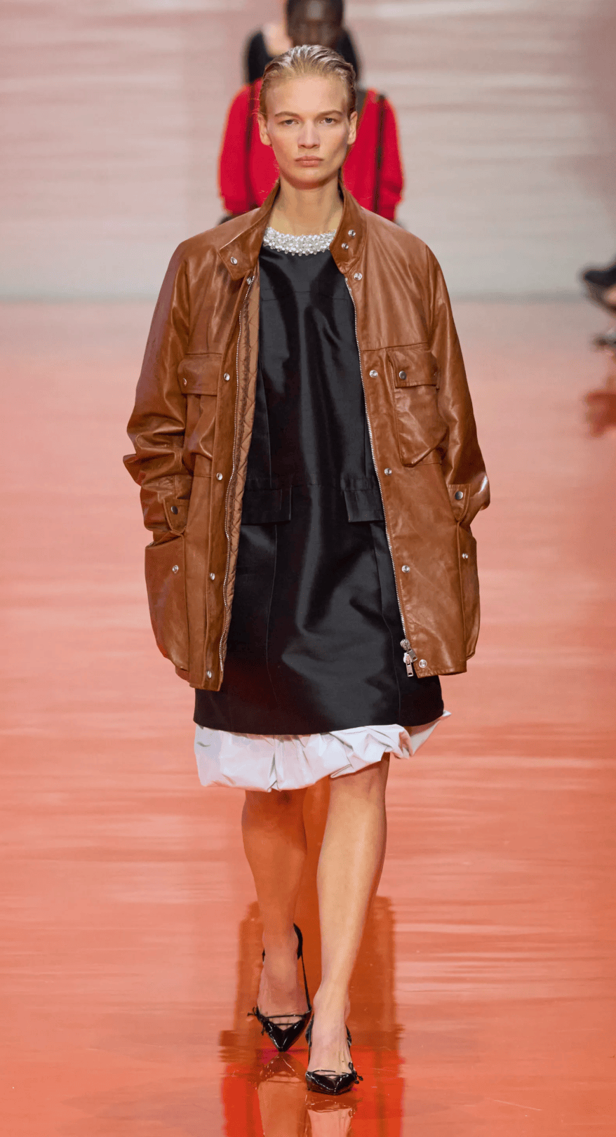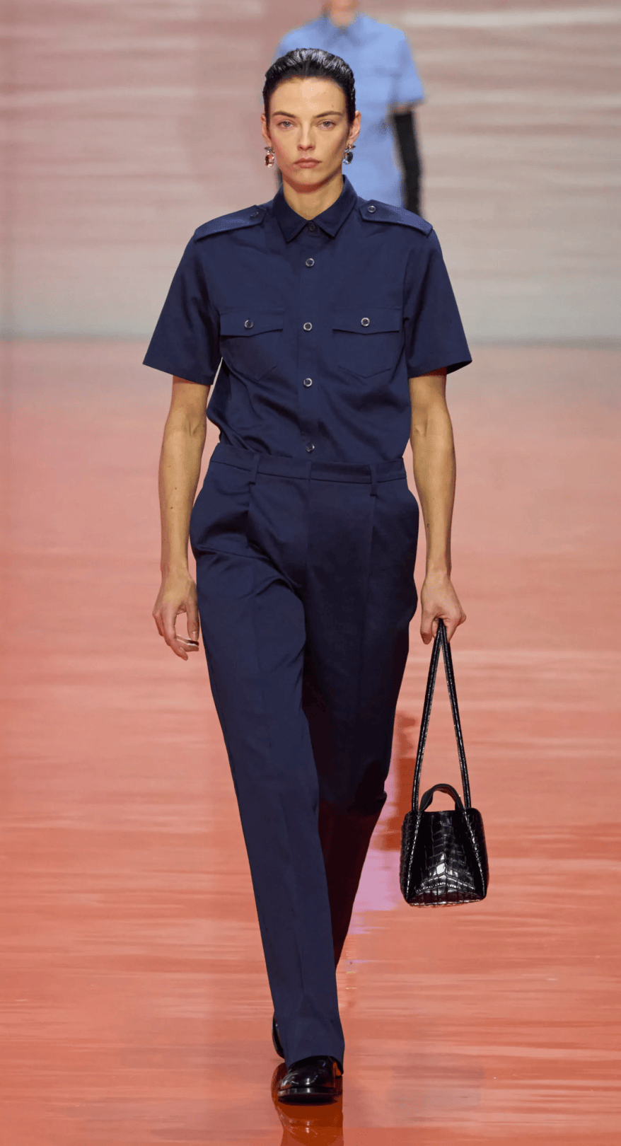 这点在Prada本季大秀可看到,工装元素贯穿始终。从男女通穿的工装套装,到有工装口袋标志元素的大A摆连衣裙,以及酷飒中性的工装外套,都让每组look更有力量感。