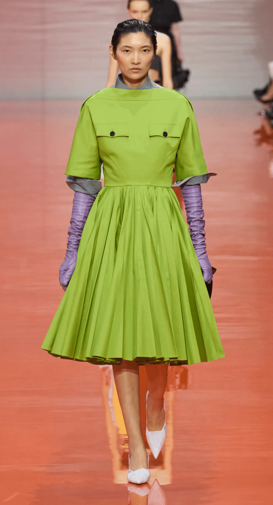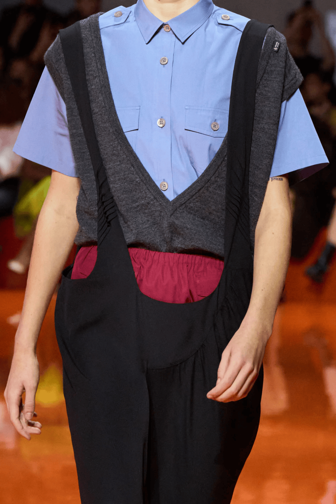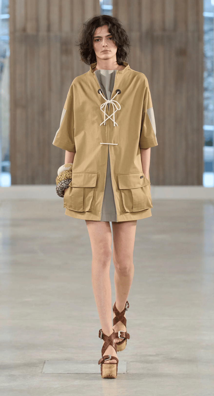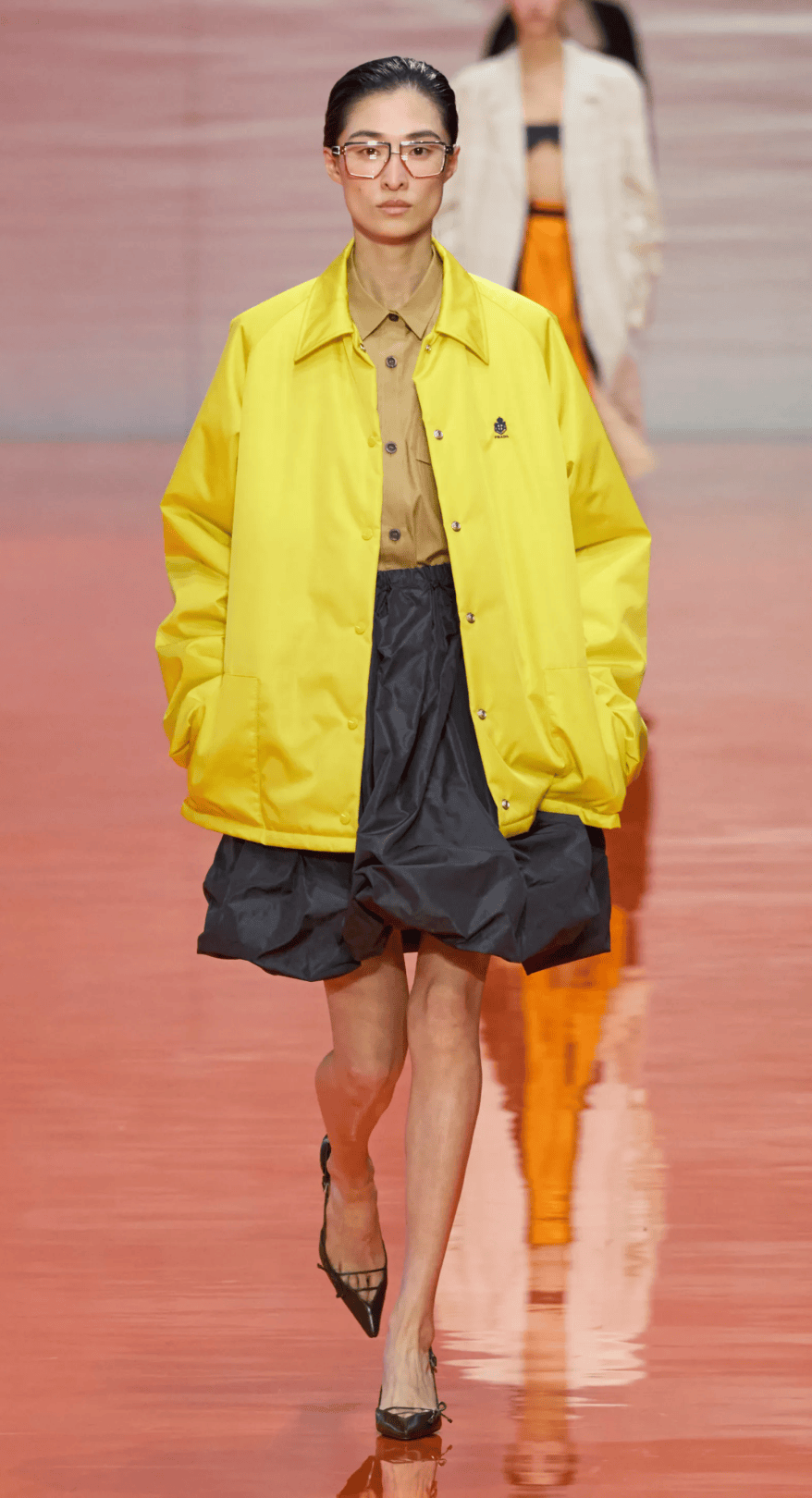 这点在Prada本季大秀可看到,工装元素贯穿始终。从男女通穿的工装套装,到有工装口袋标志元素的大A摆连衣裙,以及酷飒中性的工装外套,都让每组look更有力量感。
