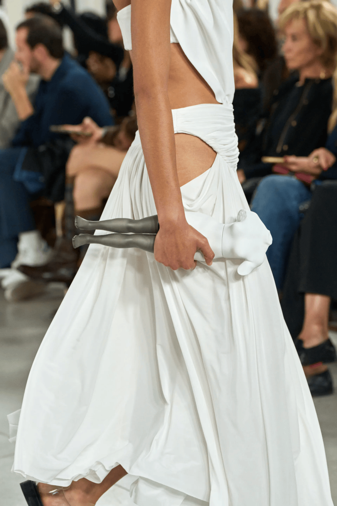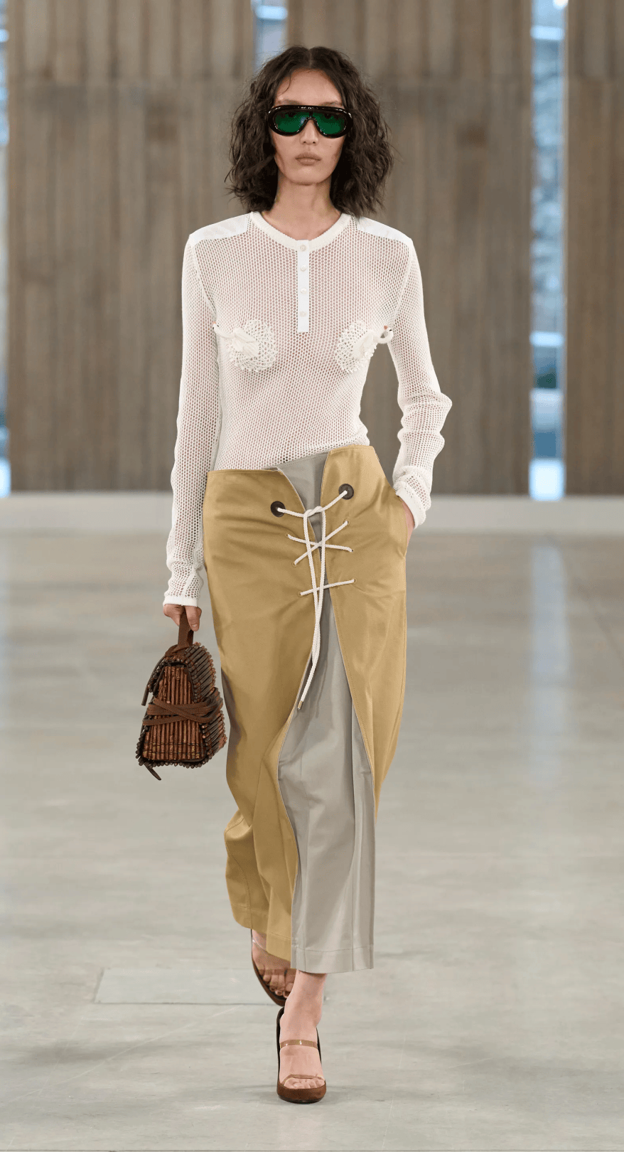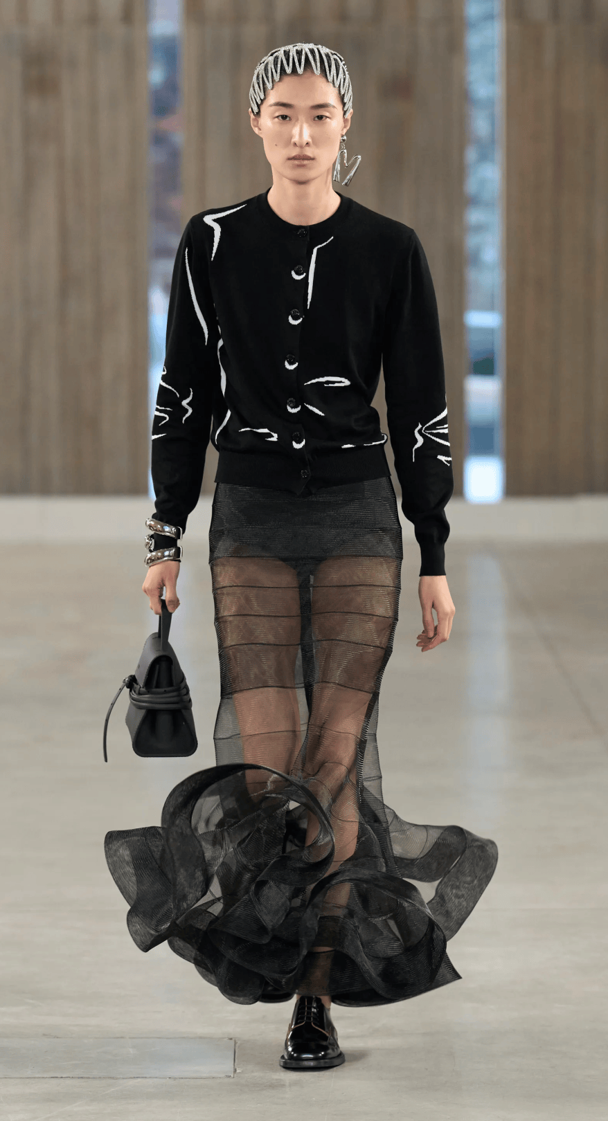绳结元素在本次大秀频频出现。从外套到半裙,垂坠飘逸又不失灵动感的细长绳,在各种单品中成为巧妙而生动的时髦。