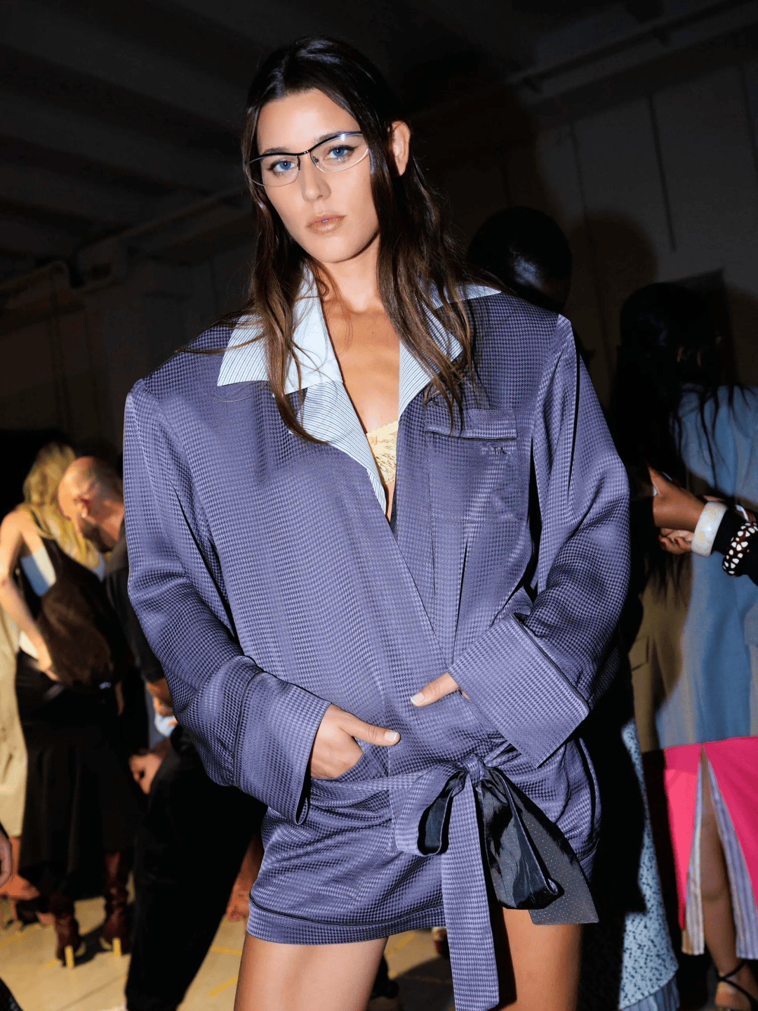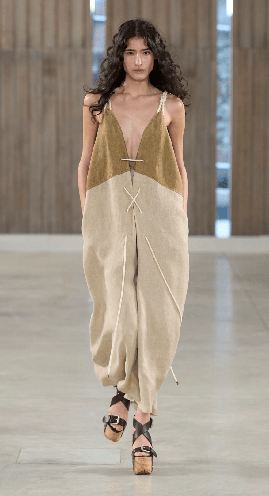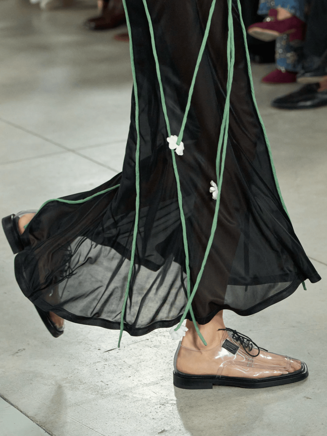 绳结元素在本次大秀频频出现。从外套到半裙,垂坠飘逸又不失灵动感的细长绳,在各种单品中成为巧妙而生动的时髦。