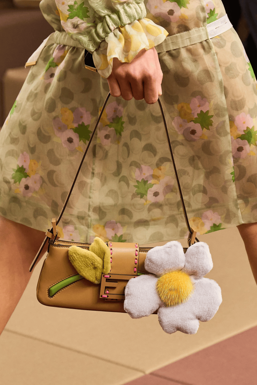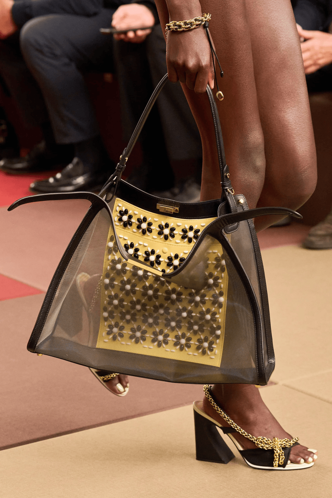 值得一提的是,本季Fendi的手袋,设计感拉满,从透明网纱的Peekaboo,中间隔层是用串珠做成的小雏菊点缀,到大小串珠制作而成的饺子包手柄......有被心动到!
