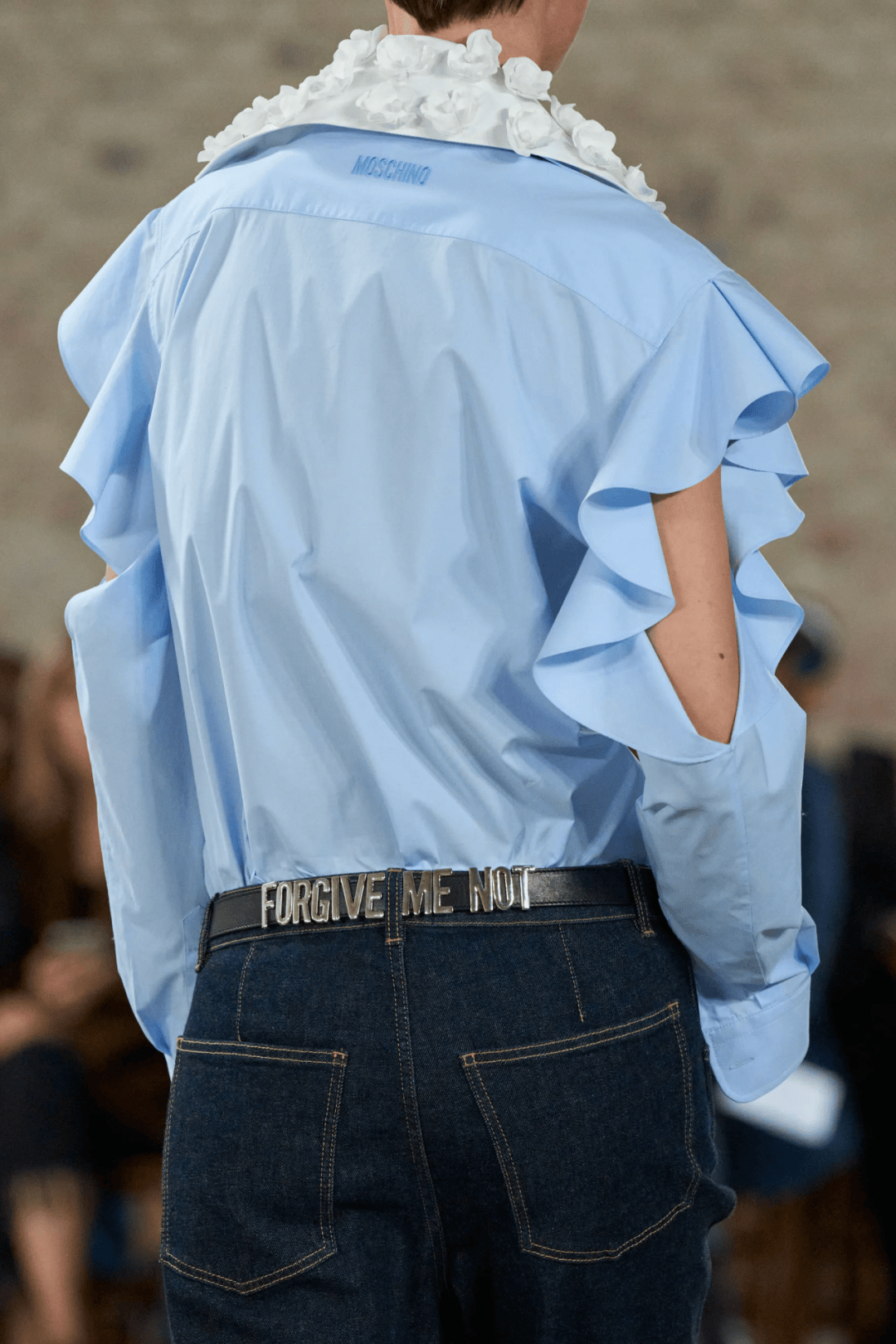 尤其是这件臂膀镂空的荷叶边衬衣,令人眼前一亮。不对称的领口,自然垂落的细绳,无不展现Moschino严肃与幽默并存的时尚态度。