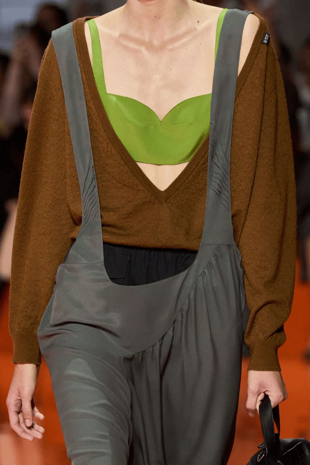 松弛随意的背带裙,内搭深V大开领口的针织衫,叠穿吸睛的撞色内衣、打底裤,让穿搭更有层次看点,看似矛盾,实则非常有巧思。