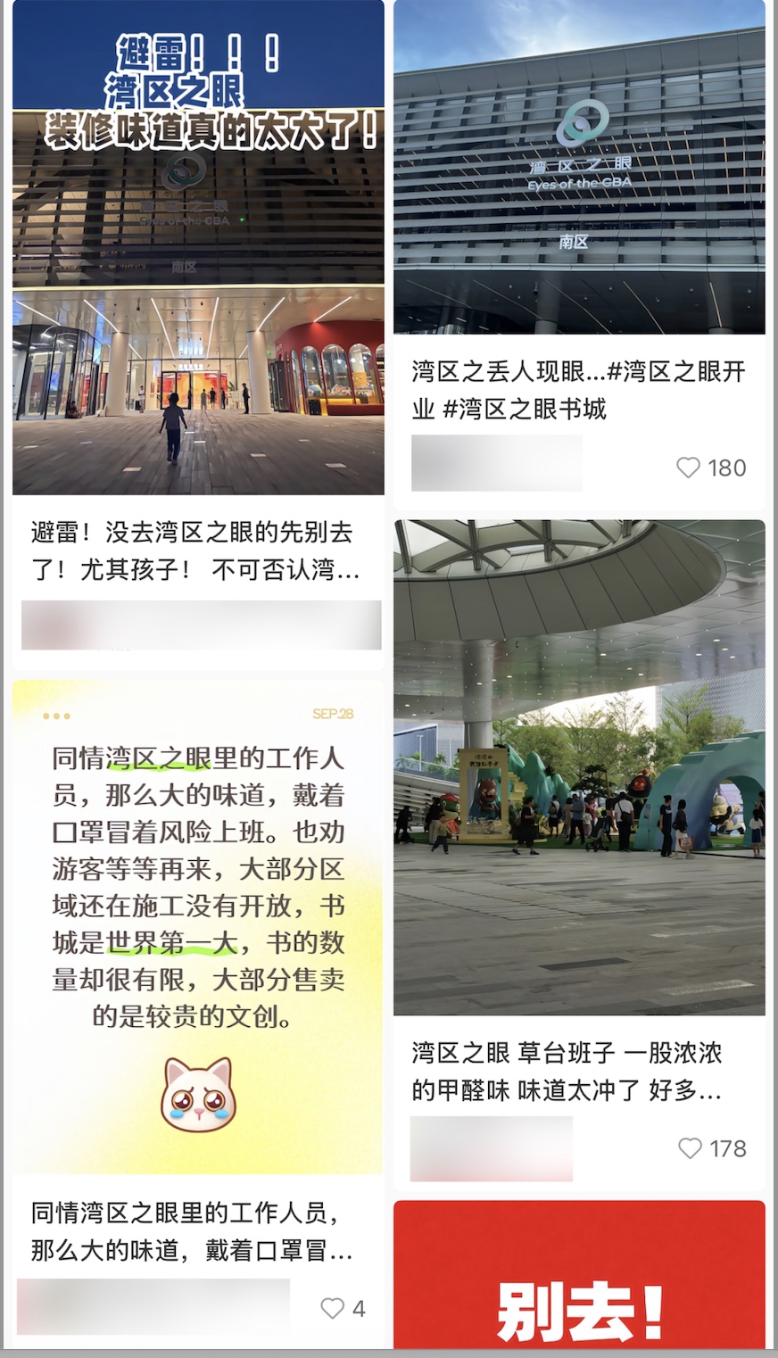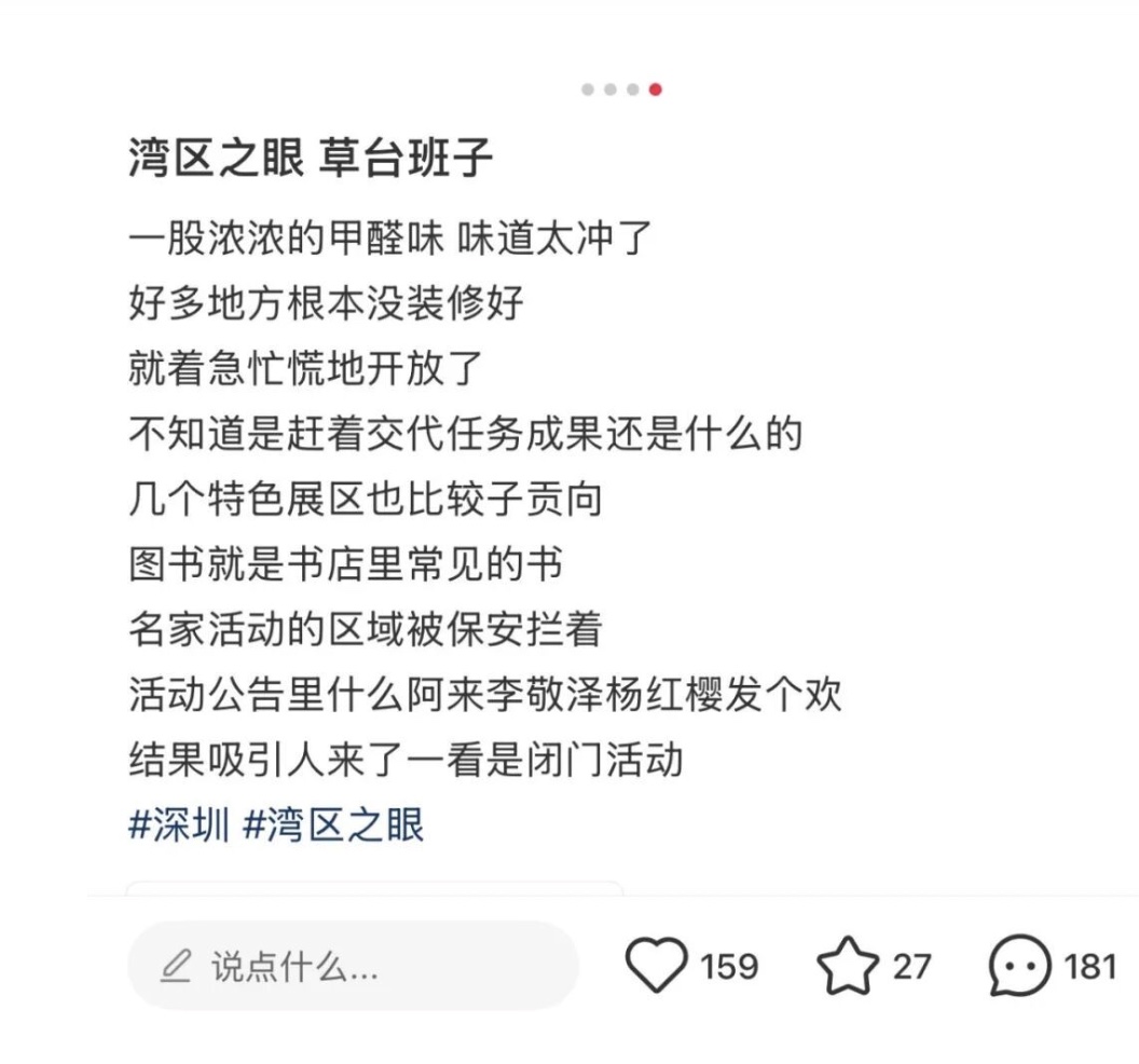 还有网友批评,“草台班子,一股浓浓的 甲醛味,味道太冲了,好多地方根本没有装修好,就着急忙慌地开放了,不知道是赶着交代任务成果还是什么的”“湾区之丢人现眼”“湾区之眼——说是全球最大的书店,但感觉噱头大于实际,人很多很多吵吵闹闹的,指示牌也没有标清楚,感觉就是急吼吼的开店来赚钱”。
