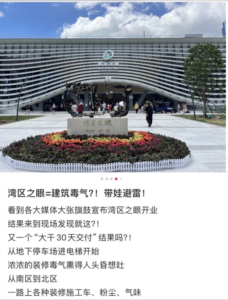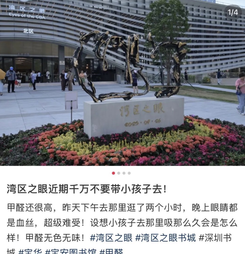近日,自称“全球最大”的深圳书城“湾区之眼”开业,但装修气味非常大,有市民称“装修毒气熏得人头昏想吐”。还有市民称逛后眼睛全是血丝,非常难受。有网友批评,“湾区之丢人现眼”。