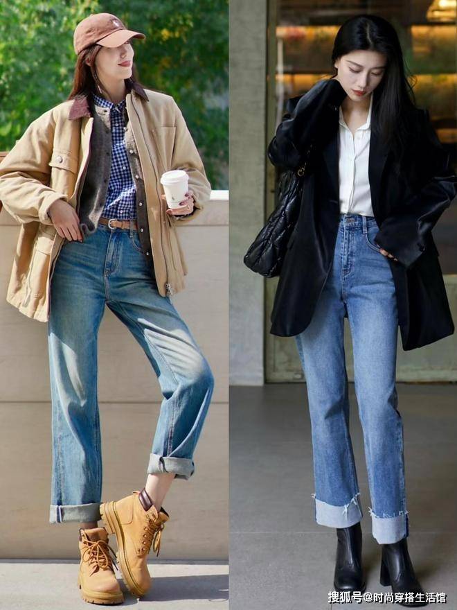 秋天除了选择西装阔腿裤之外我们还可以选择牛仔阔腿裤,尤其是选择高腰款式的版型能够有效的拉长我们的腿部线条,脚上搭配一双短靴,整个造型会更加的简单利落和时髦,同时还能让我们的穿搭充满休闲感,视觉上更加显高显腿长。