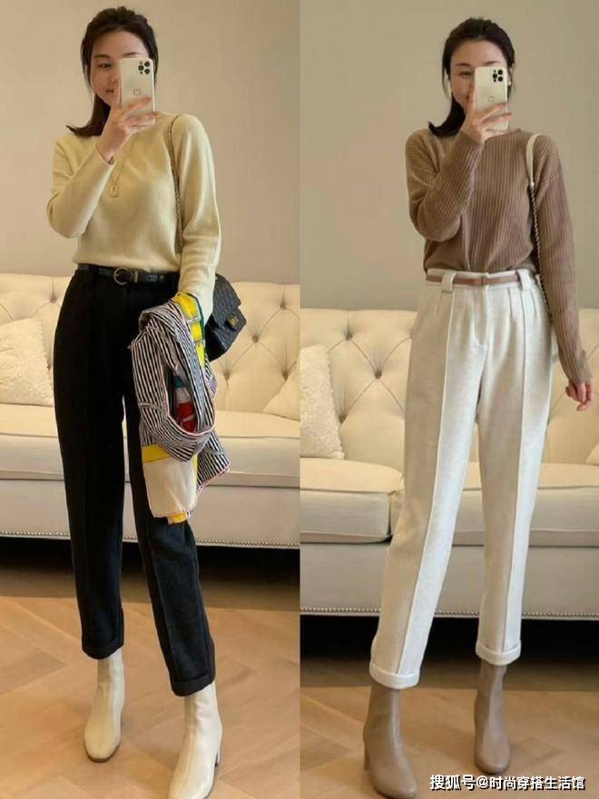 其次秋天穿阔腿裤搭配短靴你知道为什么会那么流行吗?一方面是阔腿裤是宽松的裤腿能够完美遮挡住我们双腿,像是腿粗、腿不直等问题,我们选择阔腿裤都能够轻松解决,同时脚上搭配低跟的靴子,还能起到增高显腿长的效果。这组搭配组合不管是高个子还是小个子女生穿,完全不用担心会压个子,出现累赘和显矮。