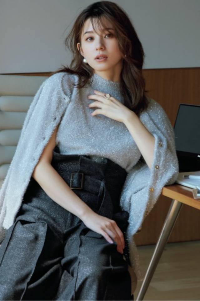 深灰色开衫内搭隐约透出的蓝色,营造出知性且清爽的和谐感。微微蓬松的领口线条与加长袖管,赋予开衫叠穿更丰富的层次感和深度。