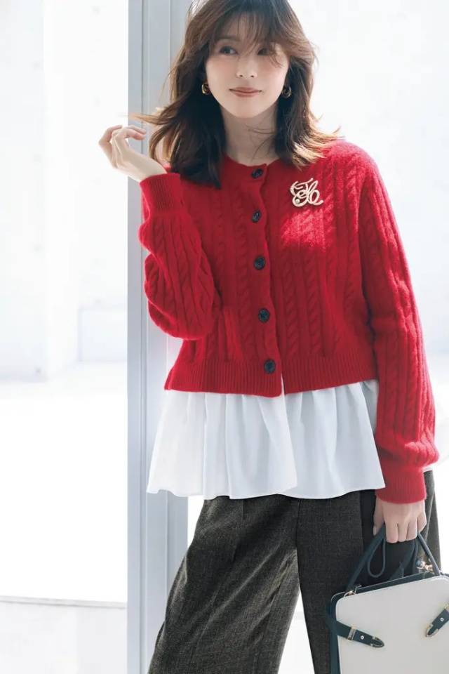 本季,羊毛羊绒针织系列中,新增一款多用途披风式开衫,支持三种穿法。单件套头时,褶皱设计与纽扣细节展现优雅披风效果,清新时尚。鲜艳的流行红色为秋季造型增添亮点。