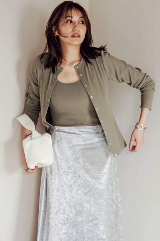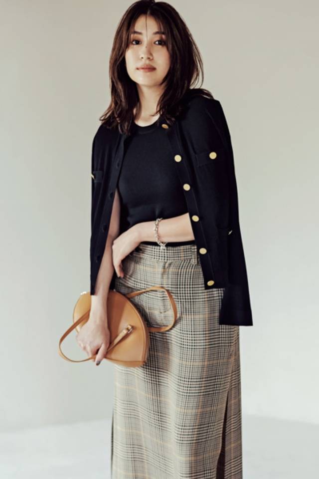 尽管色调偏暗,但金色纽扣的设计使这款开衫成为了极具亮点的单品。金色的细节在深色调中熠熠生辉,为整体造型增添了几分奢华感。搭配无袖内搭,外面适度披搭,露出的肌肤既显清爽又不失优雅,展现出一种恰到好处的性感。搭配一条格纹半身裙,更是完美展现了成熟气质,既稳重又富有活力,平衡了优雅与个性,展现了独特的时尚魅力。