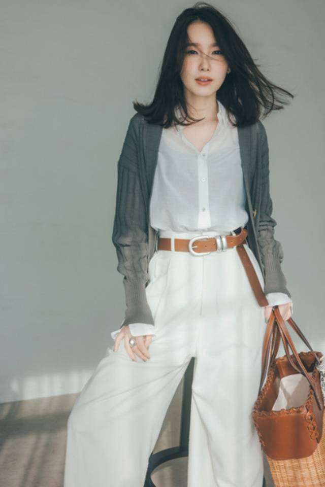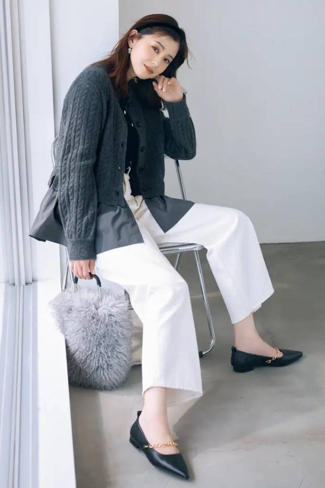 将同样一件灰色开衫与白衬衫搭配,呈现出截然不同的效果。秘诀在于将衬衫换成轻盈薄纱材质,细腻的透视感与宽大长开衫的成熟气质相得益彰,既不显刻板,反而散发出独特的时尚氛围。