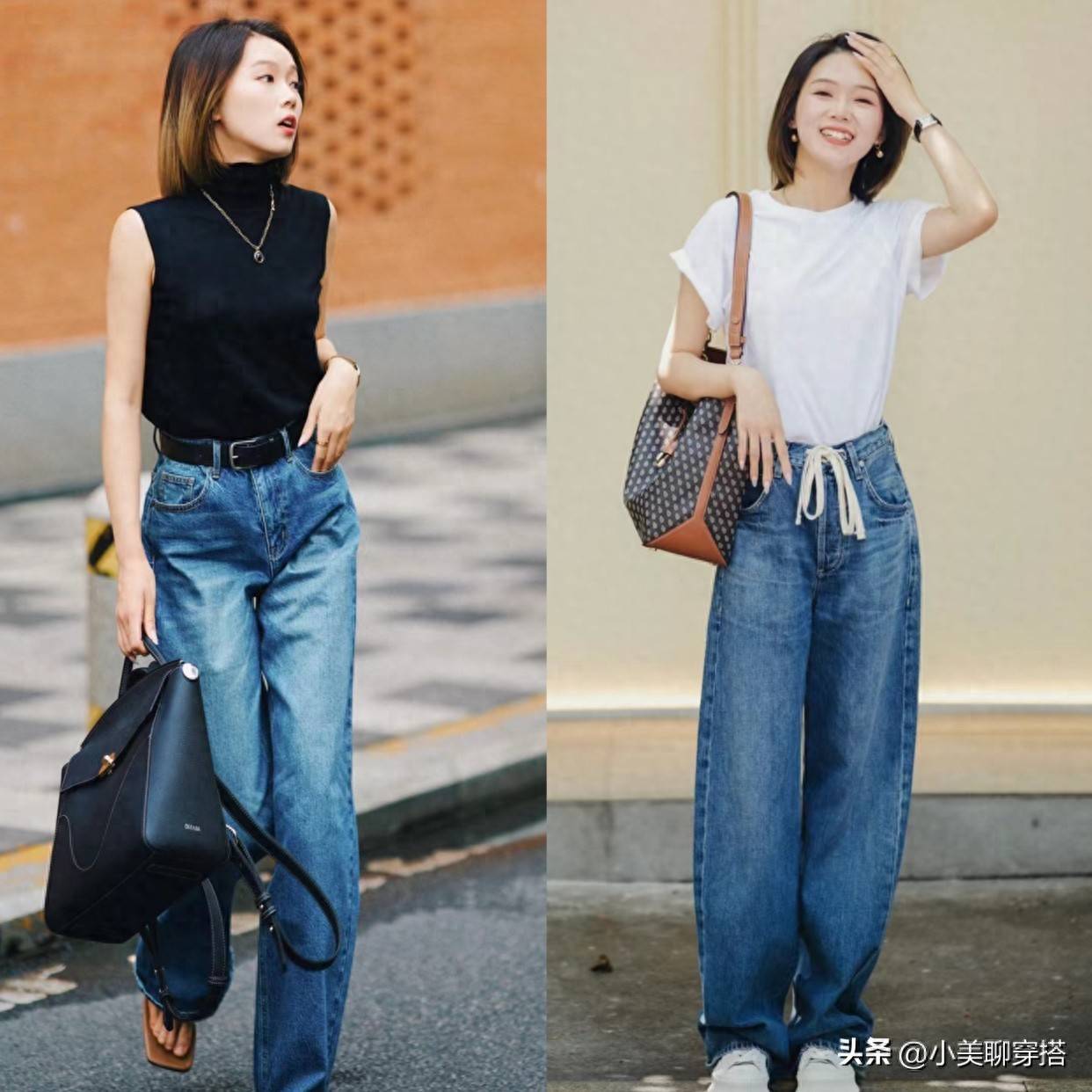 搭配牛仔阔腿裤时,如果我们是梨形身材的女生,那就要选择上窄下宽的搭配方法了,做到宽窄平衡,彰显出上半身瘦的优势,又可以穿出大长腿。