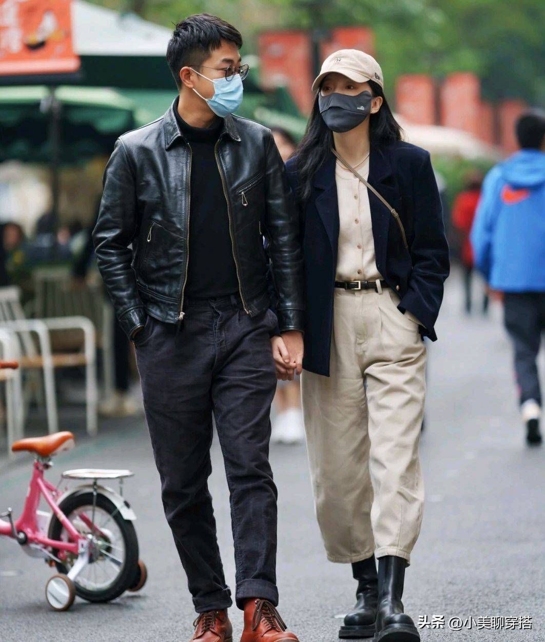 小情侣们真的是成都街拍中最甜蜜的风景了。女生选择了黑色的西装搭配白色工装裤,简洁利落,很帅气的感觉。男生则选择了黑色的皮衣,他们黑色的情侣装看起来和谐又帅气,稳赚回头率。