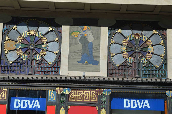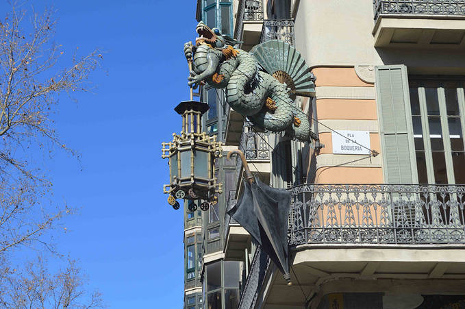 这幢楼正对着我居住的小巷,上面有龙有扇有伞,还有日本人形象,估计是 ATR NOUVEAU - 新艺术流行时期的作品。巴塞罗那新艺术的代表人物是 ANTONI GAUDI 安东尼-高迪。人称巴塞罗那为“高迪之城”。下一篇我会带大家去 一 一 欣赏高迪的作品。今天的计划是逛老城。