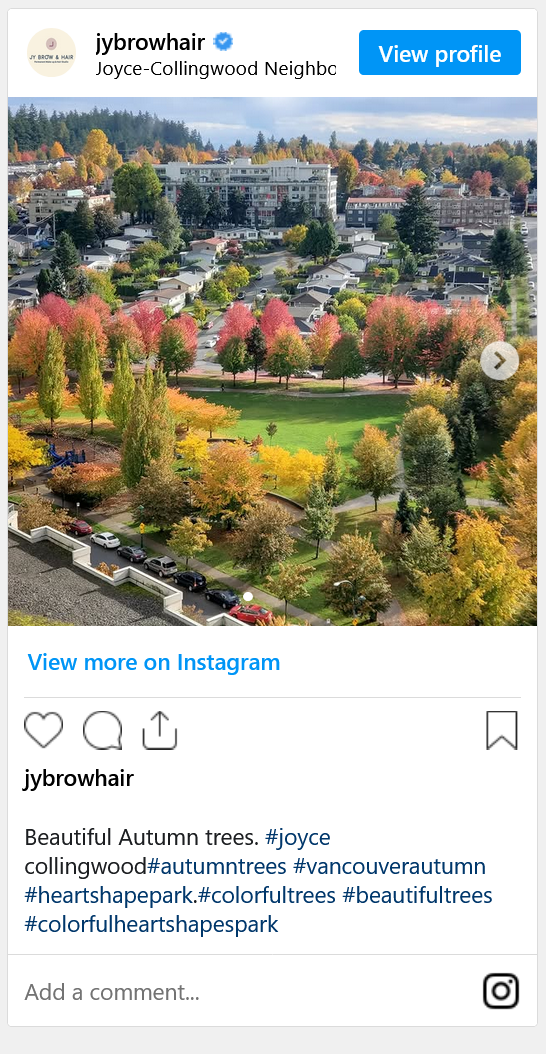 Aberdeen 公园(Aberdeen Park)春天有可爱的樱花,秋天有美丽的红叶。 如果您想一饱眼福,不妨到附近的其他街区看看,也有醉人的秋色哦。