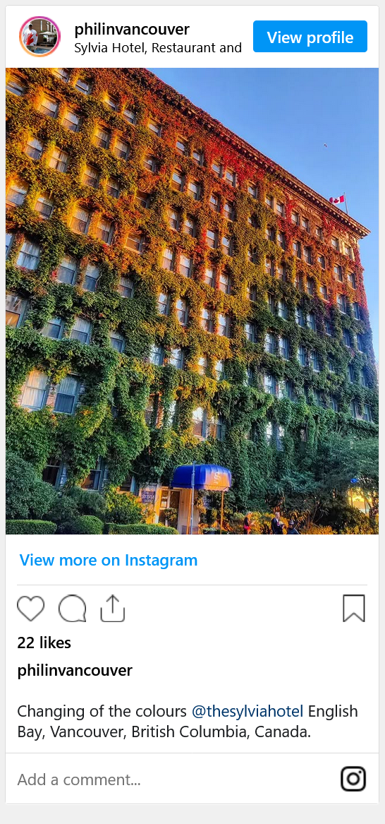 英吉利海湾(English Bay )是大温民众夏季的最爱,但秋季在附近散步的人则是另一种享受,因为Sylvia 酒店著名的外墙会从绿色变成五彩斑斓的颜色。