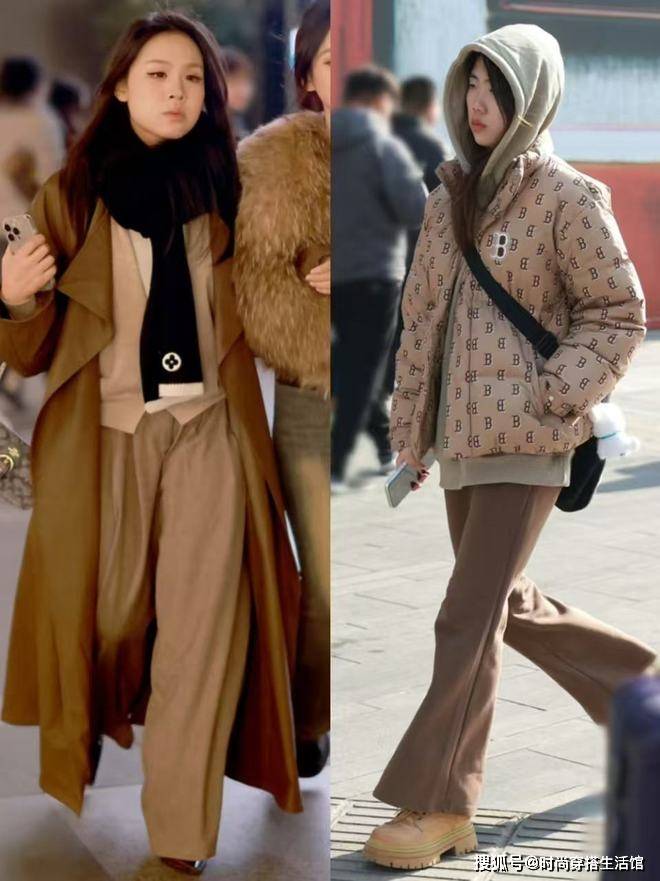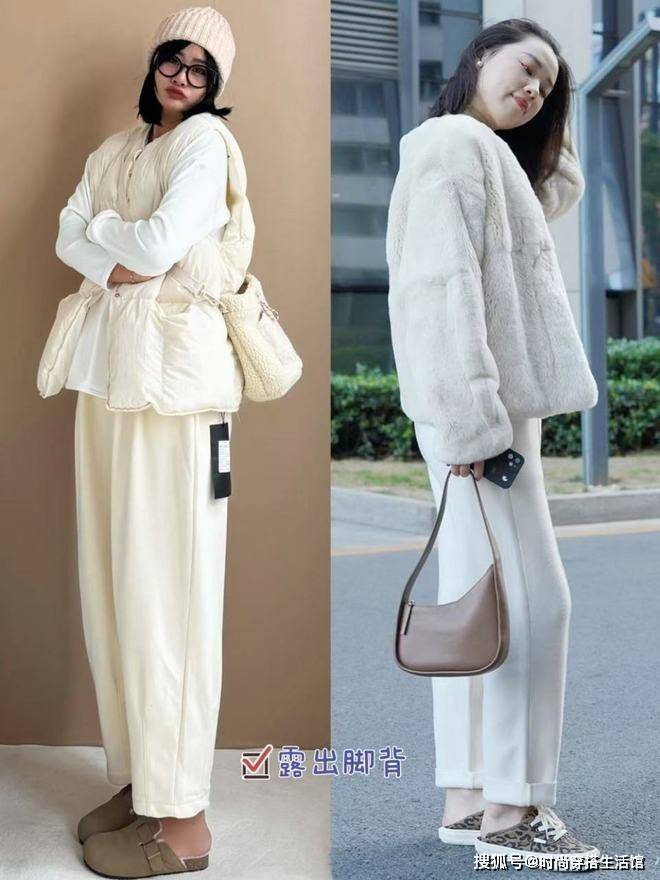 奶奶裤虽然舒适保暖,但整体版型上不会很厚重,即便搭配略显蓬松的羽绒服也不会显得臃肿。如果是小个子女生的话,建议穿奶奶裤搭配短款羽绒度,强调腰线位置,划分上下身材,塑造完美的三七分比例,视觉上更显高。