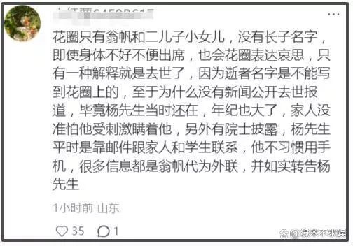 清华大学发布的悼念花圈上,挽联署名仅有翁帆以及杨振宁的二儿子和幼女,未见长子姓名。网友纷纷表示,即便杨光诺身体欠佳难以出席,通常也会透过花圈表达哀思。如今其名缺席,最合理的解释便是他已离世。