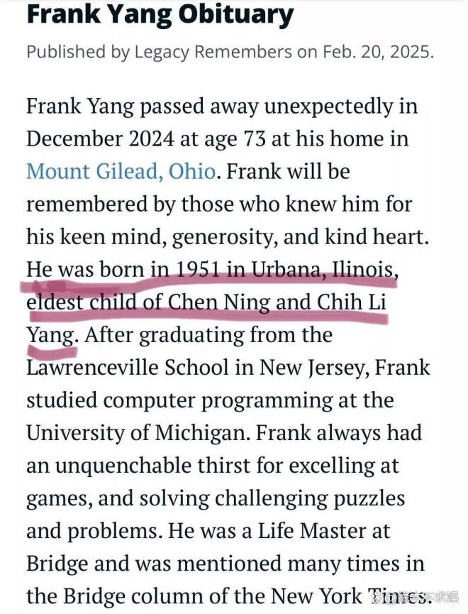 报道称,Frank Yang于2024年1月在俄亥俄州芒特吉列德的家中意外去世,享年73岁。认识他的人会记得他敏锐的思维、慷慨的品性以及善良的本心。