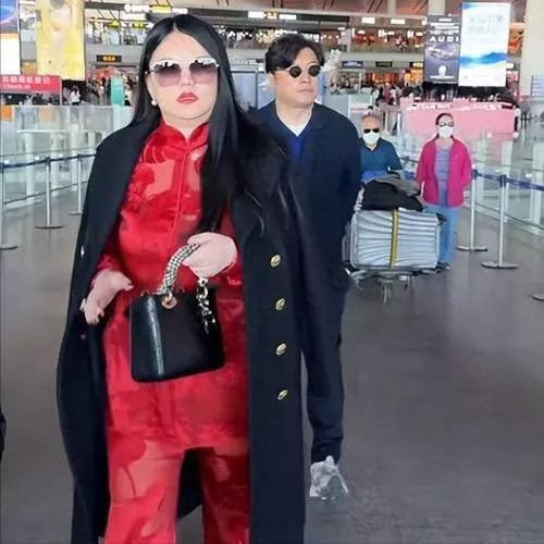 在机场的路透图中她穿着一个大红色的打底,披着黑色的大衣,