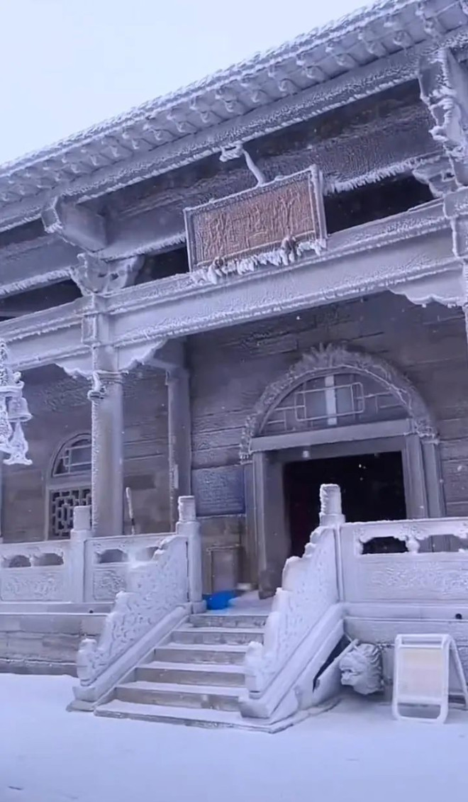 近日,不少网友拍到五台山北台龙王殿被“冰封”的景色,白茫茫一片,宛若仙境。