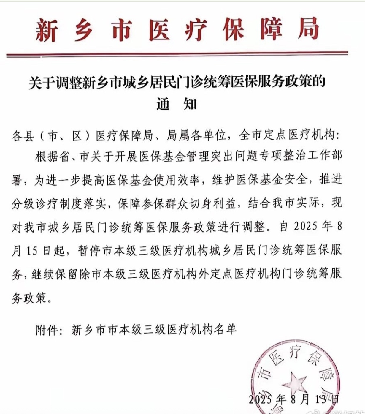 当日晚些时候,华商报大风新闻报道,6月13日,新乡市医疗保障局曾发布《关于明确职工和城乡居民门诊统筹日支付限额的通知》,其中提出,根据省、市关于开展医保基金管理突出问题专项整治工作部署,为“维护医保基金安全”,要求城乡居民门诊统筹日支付限额50元,在职职工日支付限额150元,退休职工日支付限额200元,其它待遇政策保持不变。