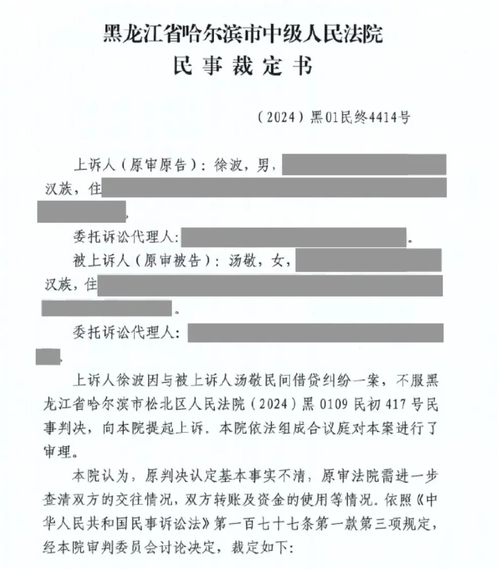 黑龙江省哈尔滨市中级人民法院出具民事裁定书指出:原判决认定基本事实不清,原审法院需进一步查清双方的交往情况,双方转账及资金使用等情况。