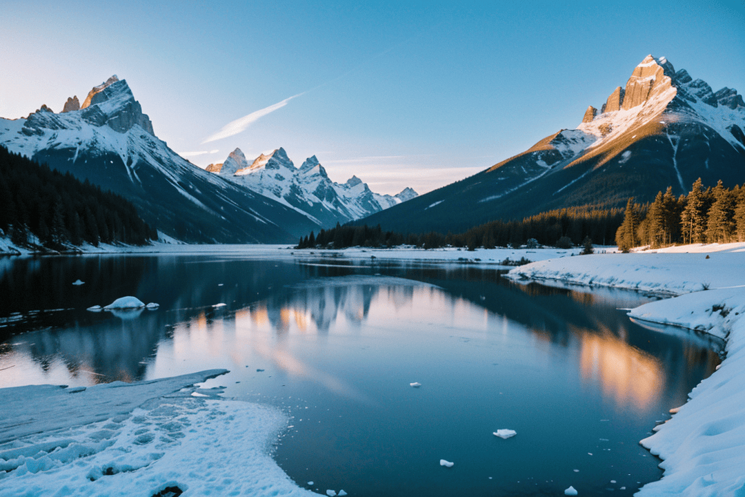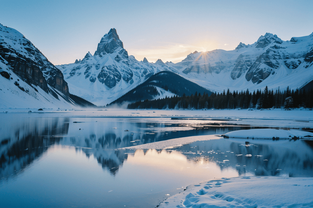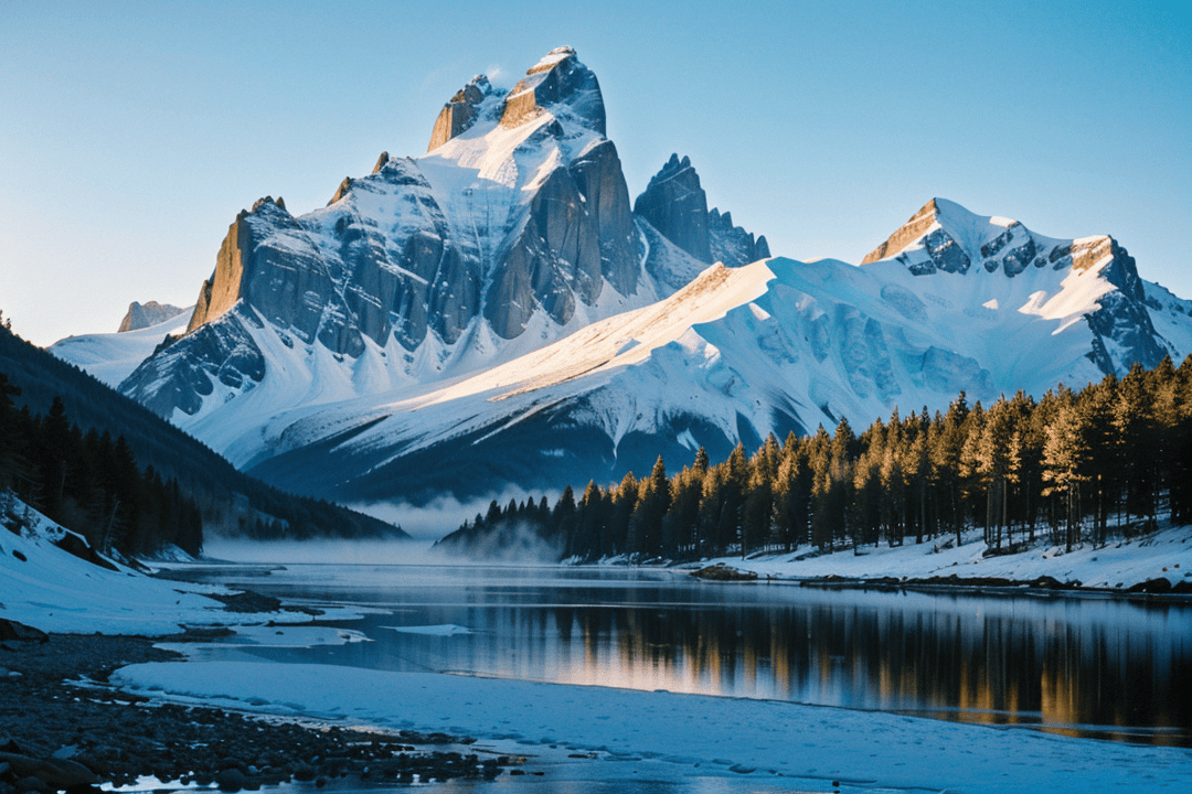 清晨,百内的群峰被晨雾轻轻笼罩,雪顶在第一缕阳光照射下闪着淡金色光芒。湖面平静如镜,倒映着群峰的轮廓和天空的颜色。