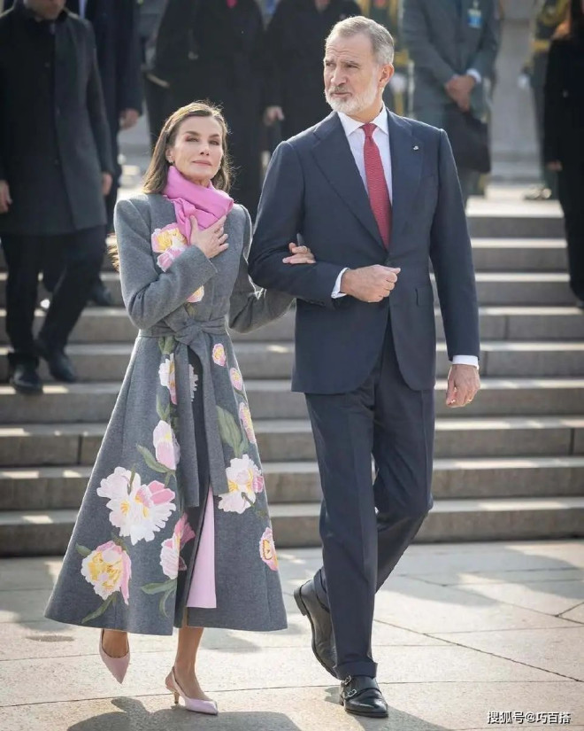 选择灰色牡丹印花大衣时,莱蒂齐亚选择内搭粉色连衣裙,与粉色低跟鞋搭配,和谐统一又不突兀,又美又俏,一点不像53岁的人,状态保持真棒。