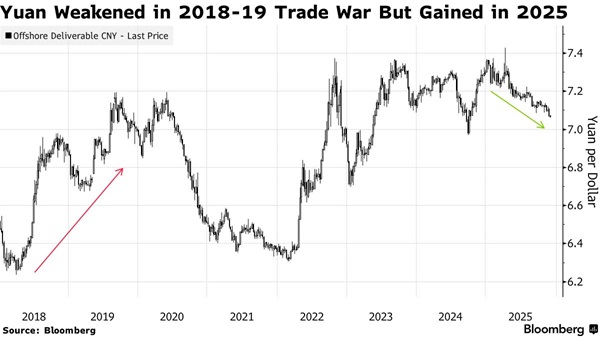 离岸人民币在2025年迄今已兑美元上涨近4%,因为北京当局通过每日中间价支撑人民币,股市上涨吸引了资金流入,同时美元走弱。